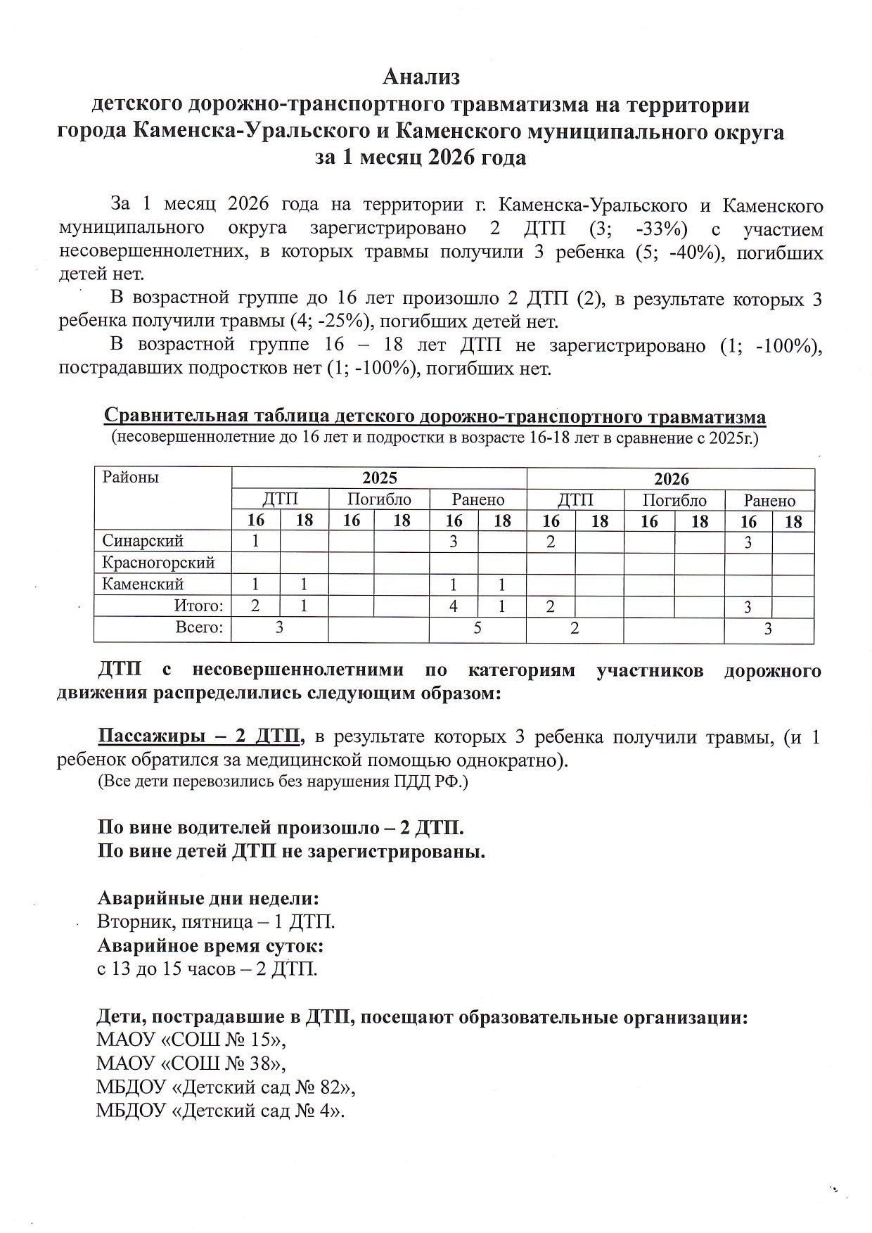 Анализ детского дорожно-транспортного травматизма на территории города Каменска-Уральского и Каменского городского округа за 4 месяца 2025 года